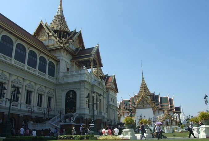 大皇宮(The Grand Palace)緊鄰湄南河,是曼谷中心內一處大規模古建筑群(計28座),總面積二十一萬八千四百平方米。大皇宮是仿照故都大城的舊皇宮建造的,經歷代君王不斷擴建,終于建成現在這座規模宏大的大皇宮建筑群。大皇宮是泰國諸多王宮之一,是歷代王宮保存最完美、規模最大、最有民族特色的王宮。曼谷王朝從拉瑪一世到拉瑪八世,均居于大皇宮內。1946年拉瑪八世在宮中被刺之后,拉瑪九世便搬至大皇宮東面新建的集拉達宮居住。現在,大皇宮除了用于舉行加冕典禮、宮廷慶祝等儀式和活動外,平時對外開放,成為泰國著名的游覽場所。