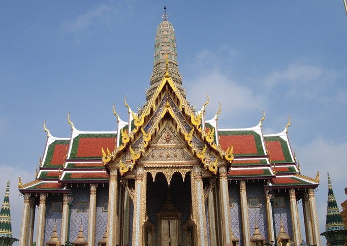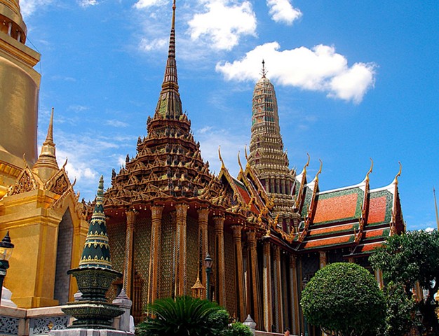 大皇宮(The Grand Palace)緊鄰湄南河,是曼谷中心內一處大規模古建筑群(計28座),總面積二十一萬八千四百平方米。大皇宮是仿照故都大城的舊皇宮建造的,經歷代君王不斷擴建,終于建成現在這座規模宏大的大皇宮建筑群。大皇宮是泰國諸多王宮之一,是歷代王宮保存最完美、規模最大、最有民族特色的王宮。曼谷王朝從拉瑪一世到拉瑪八世,均居于大皇宮內。