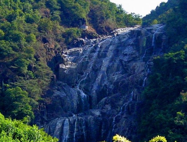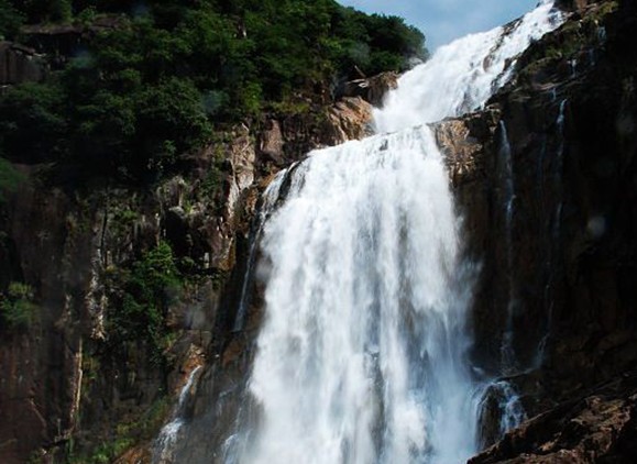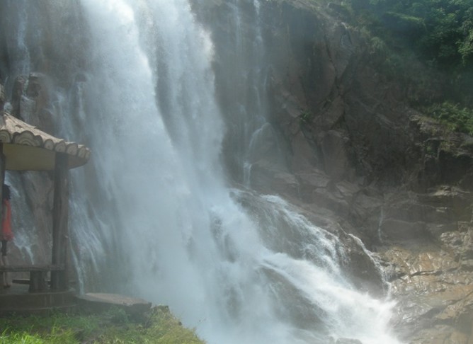 車子在山腳下停靠后,遠遠望去,前面深綠色的山峰上如掛著一幅隱約晃動的瑩亮的素色大綢幅,煞是好看。我懷疑那是不是以前的神仙在洞穴前垂掛的珠簾。我們徒步走在崎嶇蜿蜒的山間小路,朝著瀑布前進。起初聽到的是潺潺的流水聲,越往前進,水聲越大,嘩嘩直響。幾米、十米、幾十米……素色大綢幅越來越大,越來越雄偉,越來越壯觀。那浩浩蕩蕩的流水,如所向披靡的隊伍向著前方沖去。