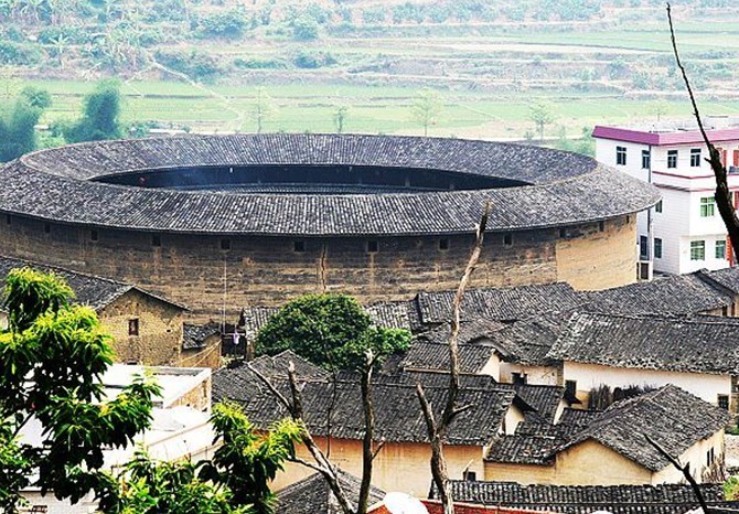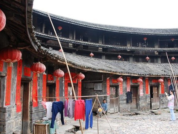 花萼樓占地面積2300平方米,建筑面積2286平方米,屬土木結構的圓形建筑。共有三環,內環為一層30個房間,二環為二層60間,外環為三層120間,共有210個房間。樓高11.9米,樓的墻體用生土夯筑而成,底層寬2米。頂層寬1.3米,樓頂為木梁灰瓦。樓的第一層不設窗,第二、三層墻上設有內小外大呈三角的槍眼,整座樓只有一個大門供出入,大門框用厚而寬的花崗巖石板組成,版權所有山東聊城聊之旅國際旅行社有限公司,轉載必究!大門板釘上堅厚的鐵皮,這些門窗設施是為抵御外人侵擾而特意設計的。樓內有面積為283.4平方米的圓形天井,用大小不等的鵝卵石鋪成,中心裝飾著一個直徑3米的古錢幣圖案,寓意著人們祈求豐衣足食的心愿。天井一側有口古井,用于防火和生活之用。樓內還有礱、碓等常用生活設施。整個土樓布局合理、通風采光、冬暖夏涼,現樓內還住著十多戶林姓人家。