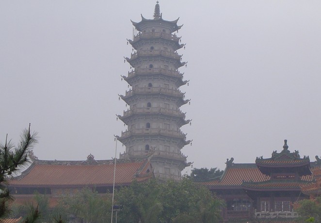 1990年,在政府支持和海內(nèi)外熱心人士捐款資助下,由千佛塔寺住持釋明慧法師,耗資4000多萬(wàn)元,在大東巖山頂建造九層石塔,并經(jīng)上級(jí)批準(zhǔn),將"南漢千佛鐵塔"移置于新千佛塔底層,統(tǒng)稱(chēng)為"千佛寶塔",由中國(guó)佛教協(xié)會(huì)主席趙樸初題署塔名,新建千佛塔九層高36米,千佛塔全用花崗巖石砌筑,高9層36米,高聳云天,氣勢(shì)宏偉。佛塔首層安放著鑄于南漢時(shí)期的千佛鐵塔。二 至八層內(nèi)壁鑲嵌著千尊漢白玉佛,第九層安裝一口一噸重的大銅鐘,并在該層內(nèi)墻存放千尊小金佛,塔內(nèi)上下共有佛像三千尊。塔頂則為一座小巧玲瓏的石塔,形成塔下有塔、塔中有塔、鐵佛玉佛金佛共容一塔的特色,被譽(yù)為寶塔建筑藝術(shù)一大奇觀。沿塔梯盤(pán)旋而上,石塔外圍砌筑走廊、欄桿,供游人登高憑欄眺望,秀麗的梅城風(fēng)光盡收眼簾。千佛殿與九曲文化游廊連接一體,成為梅州市和粵東地區(qū)的一大名勝。