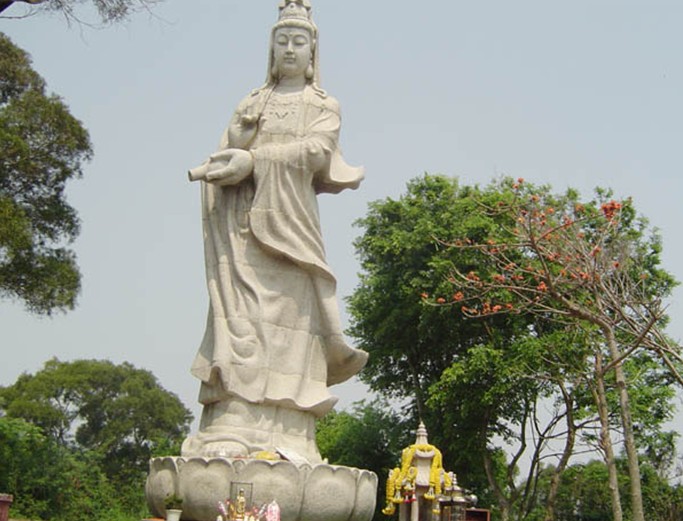 它落成于1994年5月29日,雕藝高超,面容端莊,惟妙惟肖,其左手拿甘露瓶,瓶口向下;右手執(zhí)柳枝,拈露灑人間,形象動人。這座高達12米(含蓮座2米),由總重10多萬公斤108塊石雕砌成,當(dāng)時是由市工藝美校設(shè)計,惠安縣石雕高手刻后遠途載來。其左豎一石燈。又有冊形石板刻著詩僧定持所書二詩,韻妙墨妍。