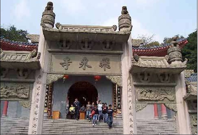 該寺位于廣東清遠市北江小三峽處的飛來寺,相傳是從安徽飛來,故名飛來寺。相傳在梁武帝普通元年(公元520年),軒轅黃帝的兩個庶子太禺和仲陽隱居在飛來峽。一個月明之夜,他們邊飲酒、邊作樂、邊欣賞眼前這峰巒疊嶂、江水凝碧、漁火點點的夜色時,總是感到有點美中不足,缺少點什么東西?猛然間醒悟:對,就是缺少一個道場,當即,他們駕起祥云,來到安徽舒州上元的延祚寺,對住持貞俊禪師說:“峽居清遠上游,千峰拱主,悉若佑命,所稱福地是也。吾欲建一道場,立勝概,師居乎?”貞俊禪師不好拒絕,也不好作答,只是微點了下頭。夜靜,太禺與仲陽作法,一時行雷閃電,風雨大作,把整座延祚寺凌空拔起搬往廣東。次日,貞俊禪師早起,發現寺院已在清遠峽山,心中不悅,口中念念有詞:“寺能飛來,胡不飛去?”空中傳來話語:“動不如靜!”從此,這寺院就落地生根,留在了飛來峽。
