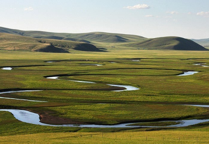 要說(shuō)莫爾格勒河最美的地方當(dāng)數(shù)中下游的草原地區(qū)。藍(lán)天,白云,青山,碧水,百花爛漫,綠草如茵,莫爾格勒河在無(wú)垠的草原上九曲回腸地轉(zhuǎn)了無(wú)數(shù)道彎,撫挽滋潤(rùn)著風(fēng)光秀美的牧場(chǎng),猶如一幅美麗的風(fēng)景畫(huà);而河邊飄著炊煙的蒙古包,游動(dòng)著的牛馬羊群,又給畫(huà)面增添了無(wú)限生機(jī)。