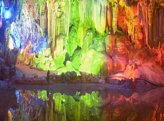 進入洞口的第一景就是古佛殿,由石幔、鐘乳石組成的獨具一格的佛殿內(nèi),三座小石筍錯有致,恰似三尊佛像。他們相貌莊嚴而又安詳,殿內(nèi)佛光普照,令人肅穆。離佛像10米處有一石柱如巨大的古榕,挺撥聳立,枝葉繁茂,被稱為 “古榕疊翠”。古榕底下是三五成群的“牧童”牽著“牛群”,踏著斜輝歡樂而歸。古榕的旁邊還有一個通天幽洞,大洞疊著小洞,給這美妙的景色又增添了一層神秘的色彩。 穿過石巷曲徑,便到了觀音殿。只見一座白色石筍,如一座盛開的荷花,花中坐著慈目低垂的“觀音”菩薩。觀音旁邊那座石筍象是抱著孩子的送子娘娘。周圍無數(shù)的小乳石就象一群群前來朝拜的仙人。其中一尊如太白金星在拱手相迎。所有這些形象生動地構(gòu)成了一個“紫竹松林”的境界。在觀音殿對面是蓬萊仙島的奇異景觀,蓬萊是傳說中的海上仙山,它奇特之處在于海上出現(xiàn)的海市蜃樓景象。這里的景色海天茫茫,空照澄碧,遠方的海市隱約可見,那紅色呈拱狀的地方象是一座城門,里面各式建筑星羅棋布,景象萬千。