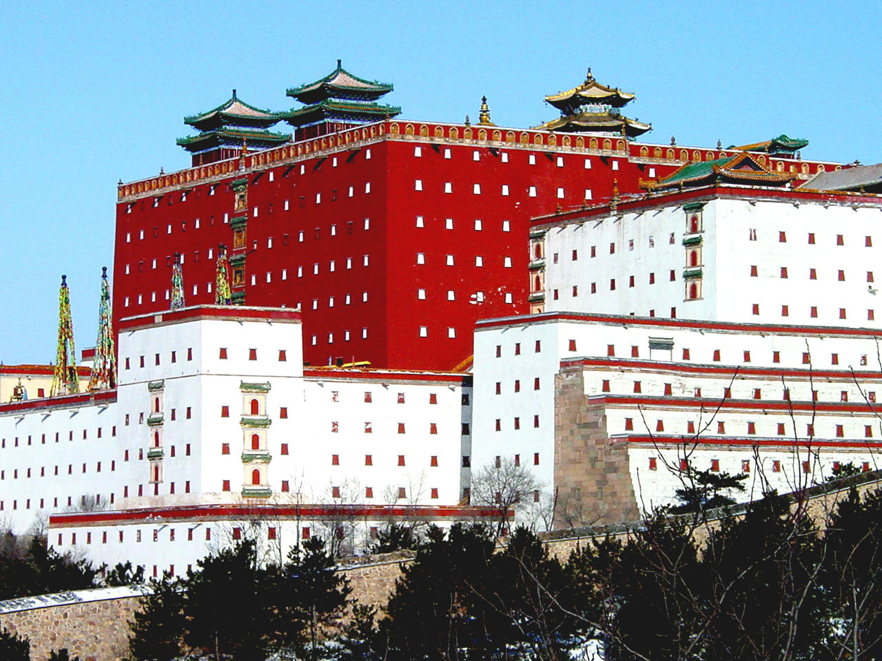 普陀宗乘之廟是仿西藏拉薩布達拉宮修建的,“普陀宗乘”是藏語“布達拉”的漢譯。廟依山建造,坐北朝南,山門內是碑閣,北是五塔門,版權所有聊城聊之旅國際旅行社有限公司,轉載必究!高十余米,有拱門三個,上建紅、黃、黑、白、綠五座喇嘛塔。門北是琉璃牌坊。牌坊北地形漸高,各式白臺、塔臺建筑因地形而散置,高低有別,變化多端。最后為雄偉高大的主體建筑大紅臺。大紅臺的正面,下面是高達十八米的大白臺,其上聳立著高達二十五米的大紅臺。紅臺內四周為三層群樓,中央是重檐攢尖鎏金銅瓦項的“萬法歸一”殿?!∑胀幼诔酥畯R布局分三個部分:前部包括山門、碑亭、五塔門;中部包括琉璃牌坊、白臺、僧房等;后部是主體建筑大紅臺及周圍其他建筑,大小共60余處,被包圍在雉堞銜連、依著山勢起伏而環寺一周的高大圍墻之內。