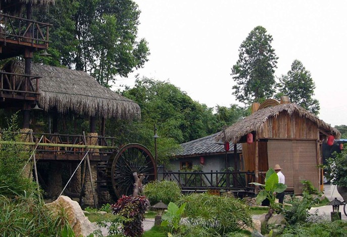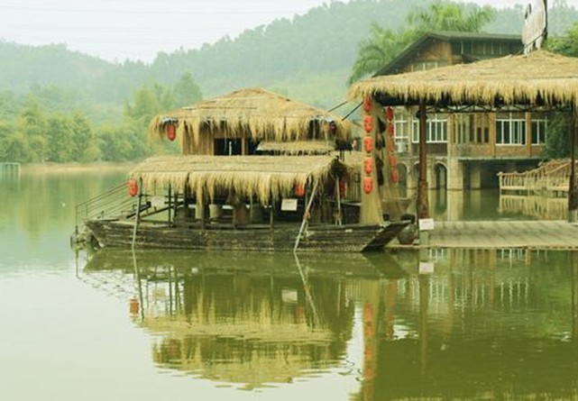 極目莊園方圓幾百畝,百畝水面,風平如鏡,或銀波閃爍,或迂回於幽篁之中,或穿行於絲柳之側,亭閣倒影似蜃樓海市,葉葉扁舟如散花點點,裝一船歡歌,載一家笑語,天倫之樂不亦悅乎!籍田園風光之茅屋草寮星羅棋布於全園,皆取法乎自然?;虬蛞郎?,或掩蔭於翠竹之下,或深藏於幽徑之中,置身其中,恍若隔世桃源,疑是玉宇瓊臺。
