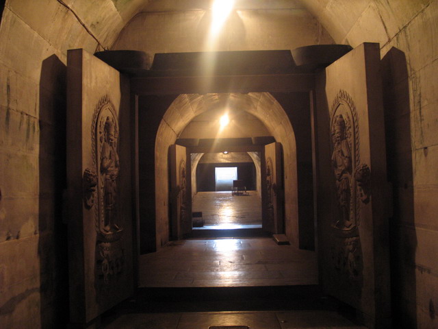 盡管清廷的遺臣為修建崇陵費盡心思,光緒還是沒有能夠在他的地下寢宮里平安地長眠下去。1931年軍閥混戰時期,一伙不明身份的兵匪盜掘了崇陵地宮,多數隨葬品被劫走。1980年6月,經上級批準,清西陵文物管理處開啟地宮,清理整修,供國內外游客參觀。這座地宮墓道全長63.19米,是無梁無柱的石拱券式建筑,共有四道石門、九座券。門樓、門垛、門框、門簪均用青白石作原料,雕有瓦脊、瓦壟、花瓶等圖案,每道石門上都有巨大的銅鑄門管扇,八扇石門上分別雕有八大菩薩立像,金券內有寶床,寶床正中有金井,光緒皇帝和隆?;屎蟮墓讟⊥7旁趯毚采?,棺槨周圍有用五彩繪制的龍山石16塊,寶床前東西各有石座兩個,座上有香箱,是存放“冊”、“寶”用的。這座地宮雖已被盜,但仍出土珠寶玉翠等文物數百件。