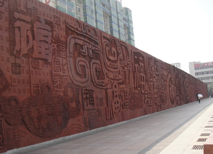 在廣場(chǎng)南側(cè)建有紫砂陶浮雕萬福壁,雙面長(zhǎng)260米、高6米、作品厚度10-16厘米,紫砂作坯陰干、雕刻,經(jīng)1160攝氏度高溫?zé)贫伞9菜鸭酥袊?guó)歷代不同寫法的“福”字1萬余個(gè),該作品經(jīng)中國(guó)美術(shù)學(xué)會(huì)雕塑專業(yè)委員會(huì)鑒定后于2000年4月收入大世界基尼斯之最。福字作為中國(guó)民間的傳統(tǒng)文化的元素,版權(quán)所有山東聊城聊之旅國(guó)際旅行社有限公司,轉(zhuǎn)載必究!有著數(shù)千年文明歷史,是人們對(duì)美好愿望無永遠(yuǎn)追求和孜孜祈愿,《萬福壁》將其與千百年來民眾賴以棲身的中國(guó)式長(zhǎng)墻結(jié)合在一起,體現(xiàn)了傳統(tǒng)藝術(shù)與中國(guó)民俗的高度統(tǒng)一。自萬福壁建成后引來眾多游人前往觸摸壁上各種寫法的福字以求沾染福氣。 萬福廣場(chǎng)始建于1978年,1979年收集完成,1980年完成