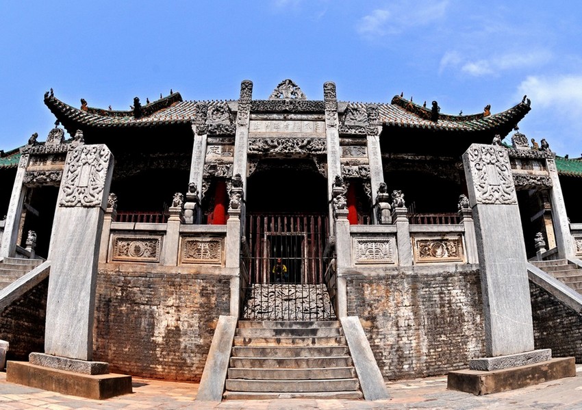 會館座北向南,聊城旅游網版權所有聊城聊之旅國際旅行社有限公司,轉載必究!占地面積約7750平方米,地面全部用一尺見方的青白石板鋪砌,現存殿、堂、樓、閣及各種建筑130余間。主體建筑由琉璃大照壁、懸鑒樓、大拜殿、春秋樓四部分組成,自南向北呈現中軸線式分布。前為琉璃照壁、鐵旗桿 、東西轅門和東西馬廄;其后為懸鑒樓、鐘鼓樓、東西廊房;再后為大拜殿、藥王殿、馬王殿;最后為春秋樓。布局嚴整,莊嚴肅穆。除后部“春秋樓”被毀外,其余保存尚好,是河南省古建筑中一個比較完整的建筑群,也是南陽市面積較大、保存較為完整的古建筑群之一。會館的前部是巨大而又華麗的“二龍戲蛛”浮雕照壁,高20米,寬13米,聊城旅游網版權所有聊城聊之旅國際旅行社有限公司,轉載必究!仿北京“九龍壁”建造,用彩釉陶瓷大方磚砌成,透花雕龍,圖案精巧,構圖藝術,金碧輝煌。懸鑒樓,又名“八卦樓”,為會館之戲樓。樓高30米,面闊17米,進深20米。建于嘉慶元年(1796年),重檐歇山式建筑,上下三層,翬飛斗拱,層層疊立;環樓上下,均有木、石雕刻;戧脊上飾以人物走獸,雕工精細,玲瓏奇觀。樓兩側有鐘、鼓二樓作陪襯。鐘、鼓二樓皆用十六根木柱支撐;東樓懸大鐘,西樓懸大鼓。鐘、鼓樓兩側,有東西轅門和馬廄。大拜殿為會館的中心,樓高34米,面闊23米,進深45米。建于同治八年(1869年),大殿建在高臺之上,為重檐廡殿式建筑。后殿原有“暖閣”,內有關羽牌位。前殿為宴會廳,雕梁畫棟,富麗堂皇。殿檐下木刻“西游記”、“封神榜”等圖案,雕工精巧,形象逼真。殿前兩側,各有大石雕,高五余尺,采用淺浮雕與透雕相結合的雕法,右壁石刻“漁樵耕讀”,山水亭臺、人物、鳥獸,雕琢精細,布局嚴謹;左壁石刻“十八學士朝瀛洲”,雕造工巧,內容豐富,形象生動。殿下所筑高臺,約四余米,磚、石包砌,周圍以石欄,中立一石雕牌坊,精雕細鏤“金龍纏玉柱”、“文武獅子”、“八愛圖”;牌坊下為“九龍口”,斜鋪云龍石雕;牌坊兩旁立門樓,筑臺階各十三級。大殿左右筑以陪殿,東為藥王殿,西為馬王殿;陪殿之前,均建有東、西廊房各十三間,把大拜殿烘托得更加雄偉、肅穆、壯觀。會館的建筑結構和雕刻藝術,集中體現了我國古代建筑藝術和獨特風格,被譽為我國的古建明珠,是河南省保存較完整的一處古建筑群,成為著名的游覽勝地,1988年被列為國家重點文物保護單位。
