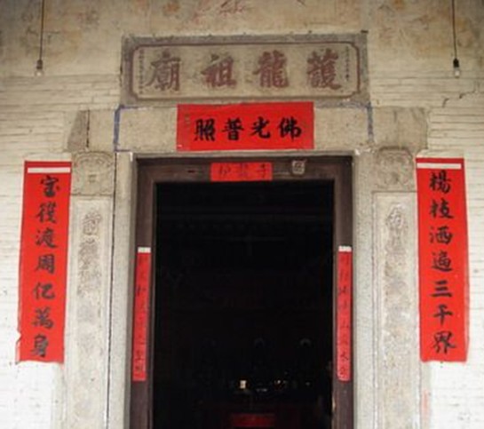 護(hù)龍祖廟在端州區(qū)黃崗鎮(zhèn)前村,始建于清初,同治十年(1871)重修。四周古樹(shù)懷抱,環(huán)境清幽,有小溪潺潺流過(guò),廟前遠(yuǎn)眺,田園秀色一覽無(wú)遺。廟為三進(jìn)院落四合院式布局,面積136平方米,大門(mén)上方鑲嵌楷書(shū)“護(hù)龍祖廟”石匾,前后殿為硬山頂,面寬進(jìn)深均三間,建筑物前設(shè)“低頭牽”,抬梁與穿十混合式梁架結(jié)構(gòu),兩殿之間以平面方形的卷棚頂廟亭相連,亭兩側(cè)空地邊緣,還用矮墻連貫前殿與后殿,使之渾然一體。