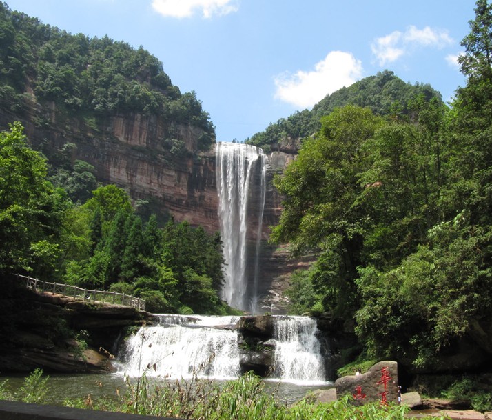 望鄉臺瀑布此瀑在去洪海途中,高152米,寬37米多,是四面山眾多瀑布中之最壯觀者。白瀑懸空勢若天河決下,水聲如雷,震山撼谷,騰起的水霧如滾滾征塵。瀑布左右,形成兩道乳白色的氣流,裊裊升浮飄逸。陽光斜照,紫煙凌虛,化出無數彩虹,隨游人觀賞角度的不同而千變萬化。