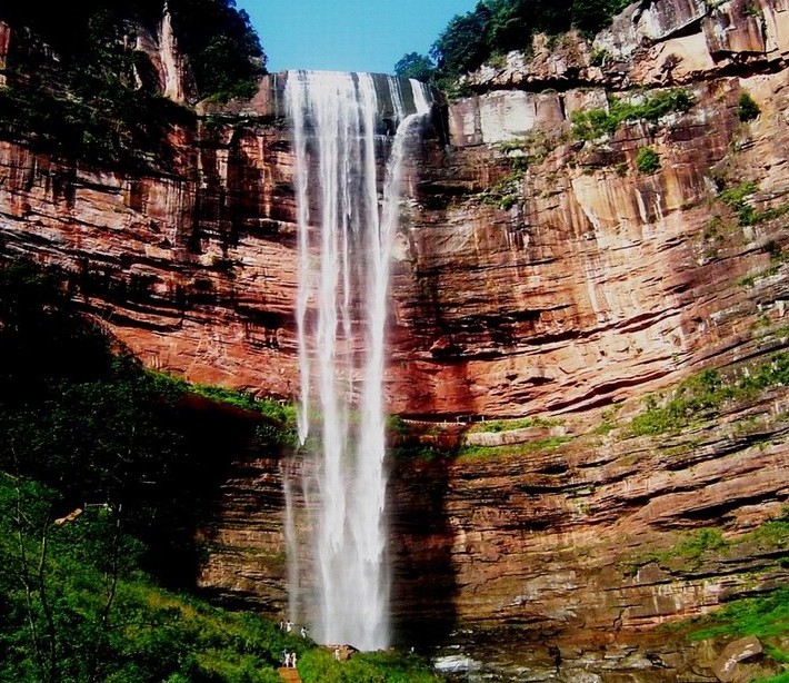 此瀑宛如一條潔白的哈達,懸垂于綠樹紅巖之中。瀑布高約89米,寬約9米。三面赤壁環回,將銀瀑揉成簇簇絮團,版權所有山東聊城聊之旅國際旅行社有限公司,轉載必究!斜飄深谷,形成節節梯形水簾,陽光射水霧,彩虹凌空,煙霧滿谷,蔚為奇觀。