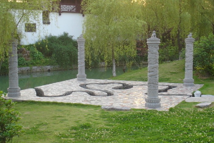 徽園大門的五根高32米的花冠狀球柱,象征著建國五十周年,全國人民在黨的領導下,在改革開放的浪潮中,取得豐碩成果,那五個大理石球,便是碩果累累之意。
