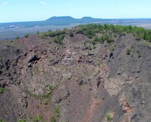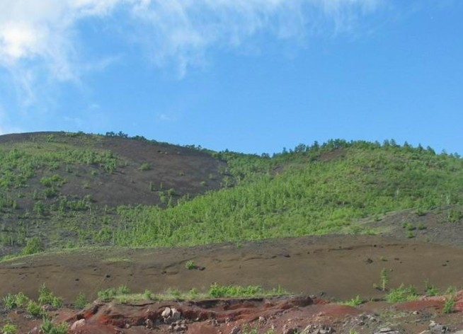 黑龍山南坡覆蓋的是火山礫,也稱火山灰?;鹕降[是氣體噴發(fā)的產(chǎn)物,當(dāng)巖漿中氣體特別充沛時(shí),就噴發(fā)出泡沫狀的熔巖,冷凝后,隨著風(fēng)向散落在火山周圍。根據(jù)火山礫的分布情況,可以推測火山噴發(fā)時(shí)這里刮的是北風(fēng)或西北風(fēng)。山體由早、晚兩個(gè)火山錐體套疊而成,早期的錐體被晚期的噴發(fā)破壞并占據(jù),從植被的疏密上可以看出早晚的差別,它是一座休眠活火山。