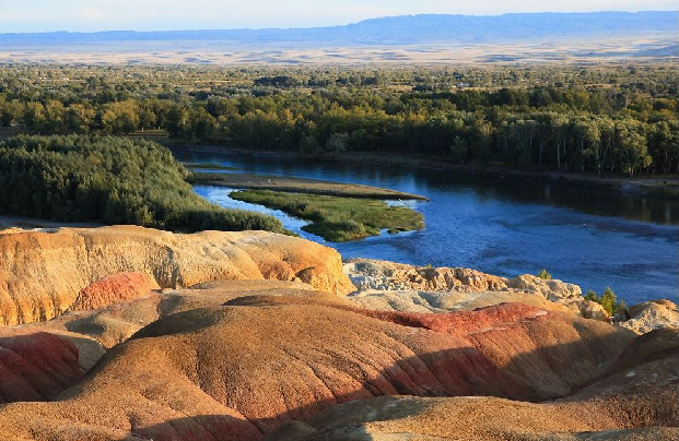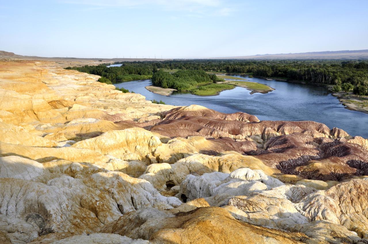 五彩灘位于布爾津縣城以北約24公里處,是前往哈巴河縣與喀納斯的必經之路。它毗鄰碧波蕩漾的額爾齊斯河,與對岸蔥郁青翠的河谷風光遙相輝映,可謂“一河隔兩岸,自有兩重天”。激猛的河流沖擊以及狂風侵蝕,形成了北岸的懸崖式雅丹地貌,河岸巖層抗風化能力強弱不一,輪廓便會參差不齊,而巖石含有礦物質的不同,又幻化出種種異彩,因此得名“五彩灘”。 版權所有聊城聊之旅國際旅行社有限公司,轉載必究!而南岸卻是綠樹葳蕤,連綿成林,遠處逶迤的山巒與戈壁風光盡收眼底。
