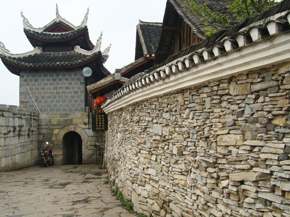 天龍屯堡古鎮地處西進云南的咽喉之地,在元代這里就是有名的順元古驛道,天龍屯堡古鎮最早是順元古驛道上的一個驛站,名叫飯籠驛。由于軍事地理位置重要,從明代開始就在這里及周邊大量屯兵,時至今日依然如幫,這里仍是駐軍重地。 清朝康熙年間,云貴總督范承勛奉旨實行“改土歸流”后,屯堡人由軍戶轉變為普通百姓。天龍屯堡古鎮更名為“飯籠鋪”,由于地理位置的重要性,這里依然是清廷的驛站和屯兵重地。歷代的屯兵都在這塊大地上留下了歷史的遺跡:明朝征南軍隊在天臺山背后的兵器加工場所(本地人呼之為“打鐵坑”);煙堆山的明代烽火臺殘壘;圍繞天臺山的古城墻;清“威同之亂時”修建有垛口、炮臺、瞭望哨的龍眼山屯,至今殘垣尚存;在天龍屯堡古鎮中,則是巷道縱橫交錯,遍布于巷道中的深邃搶眼,石拱門一夫當關,版權所有山東聊城聊之旅國際旅行社有限公司,轉載必究!萬夫莫開的軍事功能,這一切無不顯示出戰爭的遺跡,屯堡人武備的思想。明代飯籠驛最初的建設者是如今天龍“張、陳、沈、鄭”四大姓的入黔始祖們,特別是身為“通政大夫”的陳典(注:通政大夫是主管郵政的官吏),在天龍設驛站,建塘房(塘房是驛站供來往人員住宿的地方),其他三大姓入黔始祖則建“屯堡”屯扎軍隊。天龍屯堡古鎮是一個軍事防御功能完善的屯堡建筑典范,它四周建有石拱門,巷道如網,易守難攻,橫跨在古驛道上,是上扼滇喉,下控湘、粵的軍事重地。