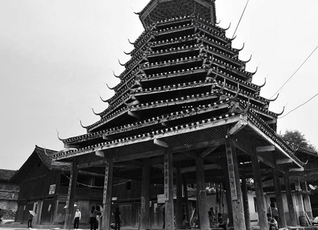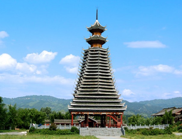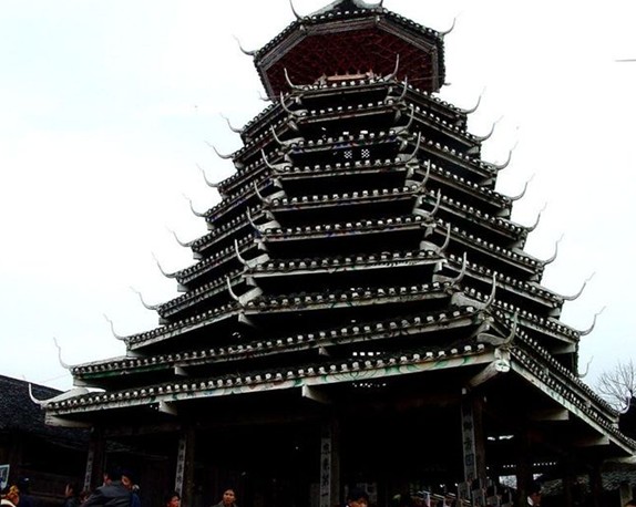 紀堂鼓樓位于貴州省黎平縣肇興鄉紀堂寨上,共3座。十分雄偉壯觀,1982年,紀堂鼓樓被列為省級重點文物保護單位。紀堂分上寨下寨,各有一座鼓樓,由十二根大杉樹原木支撐而起。塔身分八角,而頂層卻變化為四角攢尖頂花重檐。鼓樓周圍的地面和民居的走道上都以卵石鑲嵌成象征喜慶吉祥的圖案。紀堂鼓樓建筑年代久遠,曾多次修葺。1966年遭到破壞,1978年當地侗族人民自愿獻工獻料重新修復。塘明鼓樓由12根大杉木立于柱礎之上,高約22米,突兀寨中。該樓以逐層內收的梁枋和全爪柱支撐層層挑出層檐,形如寶塔,內無層板,空至寶頂。鼓樓基面約160平方米,中央用青石板鑲成一個火塘,周圍有簡易木凳。樓前有一歌坪,坪邊建有一個小巧玲瓏的侗戲臺,與鼓樓相對。該樓底層呈方形,上為八角形,共有9重檐,為四角攢尖頂。版權所有山東聊城聊之旅國際旅行社有限公司,轉載必究!鐵制寶頂下有如意斗裝飾。檐面鋪小青瓦。屋脊白色,翼角高翹而起,裝有套獸,塑有獅、虎、鳳、猴、兔、蛇、蟲、鳥等動物雕塑裝飾。樓內亦雕梁畫棟。樓上一二層檐之間有“二龍戲珠”木雕,大門上有“幸福堂”金字匾額,耀眼奪目。