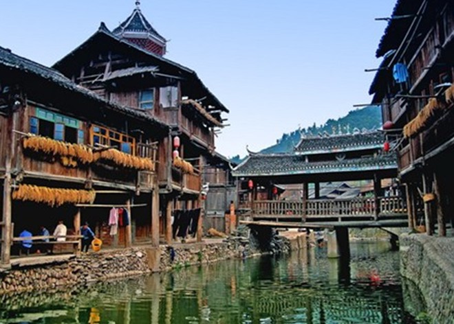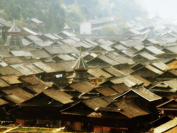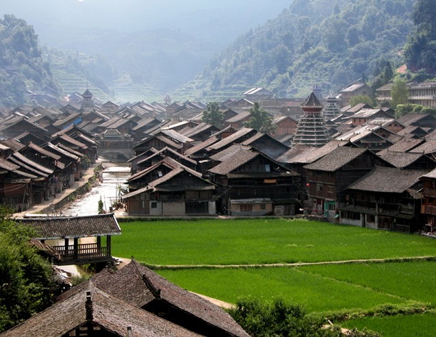 肇興,舊稱[肇洞],位于黎平縣城南70公里,是全國最大的侗寨,有世界最大的侗寨鼓樓群。全寨居住3415人,聚居侗族3125人,全為陸性侗族,分為仁、義、禮、智、信五大房族,各自建有鼓樓、花橋,大小不一,高低不等,風格各異,別具匠心。寨子里桿欄式吊腳樓房,鱗次櫛比,疏密有致,全用杉木建造。有眾多的花橋、戲樓、歌坪、禾晾、谷倉、瓢井、侗民居中等建筑,布局緊湊,結構合理。