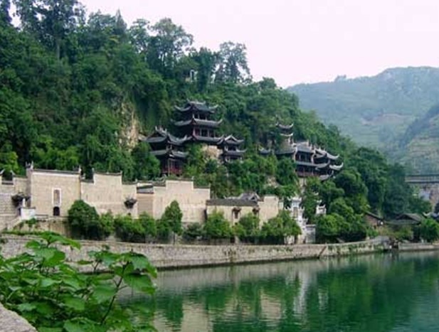 青龍洞古建筑群坐落在中國歷史文化名城——鎮遠城東的中和山上。這里山勢挺拔,峭壁懸崖。巨巖、洞穴和為一體。道、儒、佛三種宗教的寺廟群生就山腰。它背靠青山,面臨綠水,貼壁臨空,五步一樓,十步一閣,翹翼飛檐、雕梁畫棟。這些古建筑依山因地,分別采用了“吊”、“借”、“附”、“嵌”、“筑”等多種工藝,硬是在一段懸崖上筑出中元洞、紫陽洞、青龍洞、萬壽宮等一片閣樓洞天。