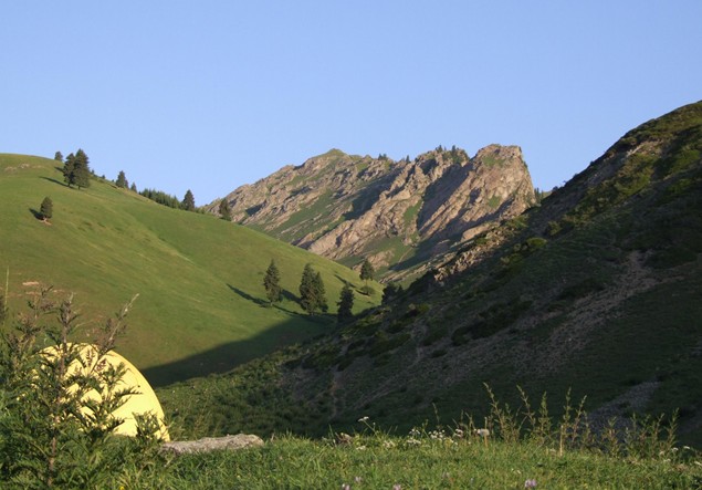 從烏魯木齊出發(fā),抵達大河沿后,租用越野車或卡車至五星牧場扎營。這里就是徒步的起點。