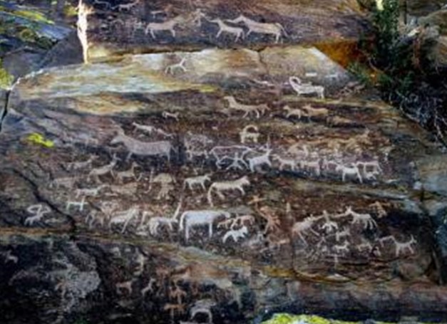 垂吉爾塔格山巖畫,位于托克遜縣城西北55公里處。在十幾、二十公里長的柯爾加依溝的山丘石壁或墜落的土黃色砂巖上,分布著數十幅栩栩如生、形態各異的古代巖畫。巖畫有放牧、狩獵和引水灌溉等圖案,以動物為主,有鹿、駱駝、豹、虎、狼、狗,最多的是大角羊。 畫中人物或行或立,或射箭或騎駱駝,他們頭戴大皮帽,腳穿長腰靴,腰部束帶,雄姿勃發。