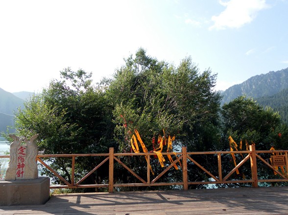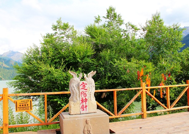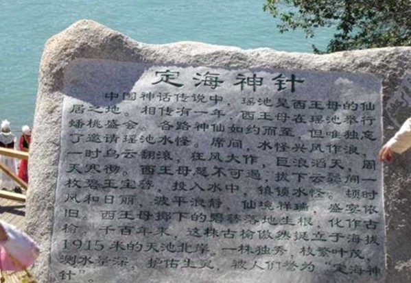 定海神針是天池周圍方圓幾公里內(nèi)唯一的一棵榆樹(shù),也是海拔最高的一棵樹(shù)。在天池湖岸邊有一棵郁郁蔥蔥,枝繁葉茂,傲然獨(dú)立的大榆樹(shù),這就是天池八景之一的“定海神針”。神話傳說(shuō):相傳當(dāng)年王母娘娘開(kāi)蟠桃盛會(huì),廣邀各路神仙,唯獨(dú)忘了邀請(qǐng)瑤池水怪。席間水怪興風(fēng)作浪,王母娘娘怒不可遏,拔下頭上的一枚碧玉簪,擲入水中降服水怪。