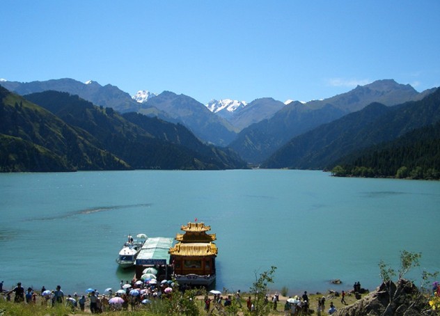 天山天池位于博格達峰北坡,海拔1900多米,系高山融雪匯集而成。傳說王母娘娘曾在此沐浴,故稱瑤池。天池風景區以天池為中心,融森林、草原、雪山、人文景觀為一體,形成別具一格的風光特色。天池共有三處水面,除主湖外,還有東側的東小天池,古名黑龍潭。潭下為百丈懸崖,有瀑布飛流直下,恰似一道長虹依天而降,煞是壯觀。