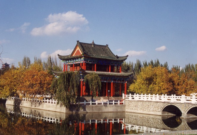 1755年,天山北部準噶爾汗國滅亡,清政府開始屯兵建造烏魯木齊城,3年后烏魯木齊城的雛形在紅山南面形成,此處一個因烏魯木齊河擺動而遺留形 成的湖泊被辟為官員休憩之地,這個湖泊當時被稱為“海子”數年后,烏魯木齊辦事大臣伍彌泰在這里建了第一座建筑物即“秀野亭”。這里是當時烏魯木齊一大勝景,有順口溜為證:“紅山嘴子海子沿,塞外風光 勝江南。”后來,不知何故,“海子”改稱“關湖”。1878年,左宗棠收復了除伊犁之外的新疆地區,四年后,伊犁回歸祖國,1884年新疆建省,新疆的統治中心為現在的烏魯木齊,首任新新疆巡撫劉錦棠將“關湖”四面取直,使“關湖”清澈若鏡,并取莊子“鑒于止水”和朱熹《觀書有感》中“半畝方塘一鑒開”之句, 改稱“鑒湖”(現在夏季可鑒湖泛舟)。1898年,戶部左侍郎張蔭桓因是戊戌變法“康黨要犯之首”被流放烏魯木齊,次年張蔭桓捐修鑒湖湖心小樓,起名“鑒湖亭”(現在辟為“湖心亭茶座”)。1912年3月15日,中央臨時政府電令新疆將巡撫改為都督,5月18日袁世凱任命楊增新為新疆都督,楊增新上臺后不幾年,鑒湖便正式成為公共游覽場所,人們稱它為“鑒湖公園”或“西湖公園”(現也簡稱“西公園”)。1918年,楊增新為紀念流放來烏魯木齊的翰林院侍讀學士紀 曉嵐,又修建一排長廊平房,命名為“閱微草堂”(1995年重建)。 紀曉嵐在烏魯木齊寫的《閱微草堂筆記》是中國清代三大著名小說之一(另兩部是《石頭計》和《聊齋志異》)。1921年,新疆省議會會長李溶提出仿北京太和殿的式樣, 修建“丹鳳朝陽閣”。竣工后,還 建起了“醉霞亭”、“火車長亭”、“曉春亭",“八卦亭“鑒湖水榭”和“閱微草堂紀念長廊”,并在“丹鳳朝陽閣”前建“置像亭”,豎置了楊增新戎裝挺立面部貼金銅像。這些亭臺樓閣建好后,楊增新取“周文王與民同樂”之意,改名為“同樂公園”(現在這些亭臺樓閣只有您自己去辨認了,因為大都沒有注明)。1928年6月,版權所有山東聊城聊之旅國際旅行社有限公司,轉載必究!北伐戰爭結束,7月1日楊增新自行就任新疆省政府主席兼總司令,7月7日被刺身亡。11月17日, 省政務廳長金樹仁被南京政府任命為新疆省政府主席。金樹仁上臺后,于每年7月7日楊的忌辰率群僚在銅像前致祭 ,以示追懷。1933年4月12日,烏魯木齊 發生“四?一二政變”, 14日,“東路剿匪總指揮”盛世才憑借軍事實力攫取了新疆的最高權力。盛世才執政后,楊增新銅像被銷毀,“置像亭”被拆除。“同樂公園”被改名為“迪化公園”。(1763年,烏魯木齊城的四門建成,乾隆皇帝給烏魯木齊城賜名“迪化城”,“迪化”意為已啟迪化,并非“啟迪教化”之意。)1942年8月29日,宋美齡來烏魯木齊勸說盛世才投靠蔣介石,盛世才為了向蔣介石表白他“歸順”的“誠意”,于9月17日軟禁了新疆所有的中共人員,并于次年9月27日將陳潭秋、毛澤民、林基路秘密殺害。1944年初春,蔣介石第29集團軍總部從甘肅省酒泉移駐新疆哈密,新疆的軍政完全被蔣介石控制。1944年9月2日,新疆伊犁地區尼勒克縣爆發武裝起義。此后,武裝反抗國民黨統治的斗爭烈火燃遍伊犁地區、塔城地區、阿勒泰地區。1945年10月14日,張治中率領國新疆和談代表團飛烏魯木齊與三區革命政府代表團談判。次年7月1日,張治中兼民黨政府任“新疆聯合省政府”主席.1947521,蔣介石為了抗衡三區日益增長的政治影響,遂任命泛突厥主義頭號代表麥斯武德為新疆省主席。8月,三區代表撤回伊犁,“新疆聯合省政府”破裂。1949年1月,版權所有山東聊城聊之旅國際旅行社有限公司,轉載必究!蔣介石采納了張治中的建議,改任包爾汗為新疆省主席。在國民黨時期,“迪化公園”曾更名為中山公園”。1949年9月26日,新疆省主席包爾汗發布省政府起義通電,新疆和平解放。