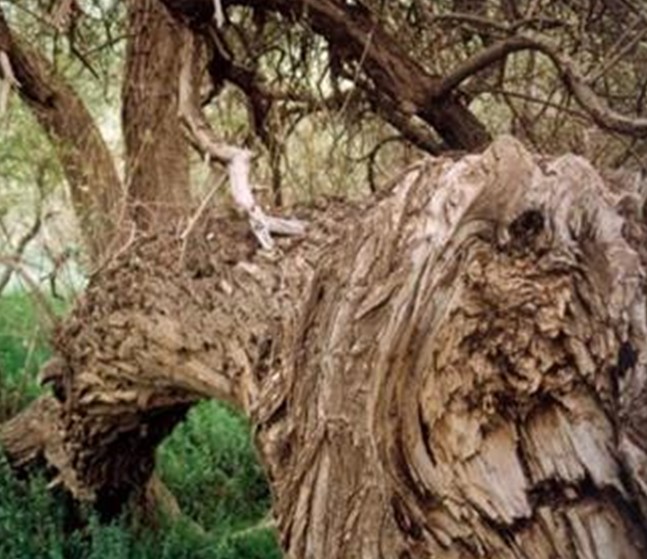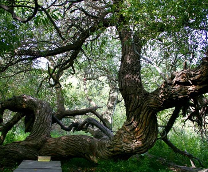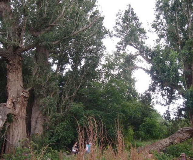 阿克蘇向北,過溫宿縣城后,再向西北行60公里,穿越一大片戈壁灘,一個崗巒起伏的小綠洲便展現面前。這個小綠洲,不是處在地勢低洼處,而是位于坡度平緩的崗阜上,海拔為1700米左右,面積僅0.4平方公里,但卻是郁郁蔥蔥,濃蔭覆蓋,流水潺潺,蜂飛蝶舞,堪稱人間仙景。當地稱它為“怪樹園”。被稱之為“圣水泉”的一汪清泉在綠洲頂部,涓涓細流,滋潤著這塊綠洲。