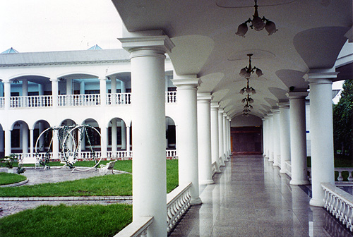候的影響。庭院內設施齊全、高檔,可獨成一體使用。有豪華套房二十余套,甲、乙套房是小型別墅式建筑,樓上臥室、書房采用櫸木地板,樓下鋪設花崗石地面。衛生間窗明幾凈,有沖浪式浴缸和按摩沐浴房。現代化的家具造型簡潔,使室內充滿現代化氣息。內庭花園綠草茵茵,一組充滿童趣的雕塑,個個小天使憨態可居,讓您忍俊不禁。轉瞬間,疲憊和煩惱都已消失,回歸自然,返樸歸真的情趣油然而生。