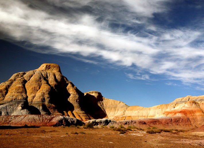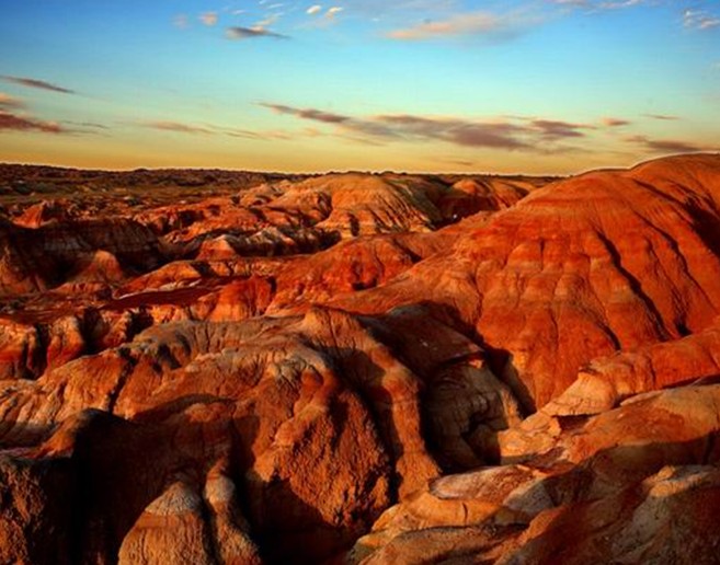 阿勒泰五彩城北距富蘊(yùn)縣城約280公里,海拔約650米。阿勒泰五彩城外觀屬丘陵地形,是受風(fēng)力和流水作用形成的侵蝕臺(tái)地,高一般10――20米,最高約50米,分布面積近10平方公里。 一般由傾角不大的侏羅紀(jì)地層構(gòu)成的阿勒泰五彩城,巖畫凹凸相間,巖石色澤多變,以紅為主,間以綠、黃、白、黑及過渡色彩,酷似五彩古堡。阿勒泰五彩城與烏爾禾魔鬼城的雅丹地貌相比更具有良好的視覺效果。
