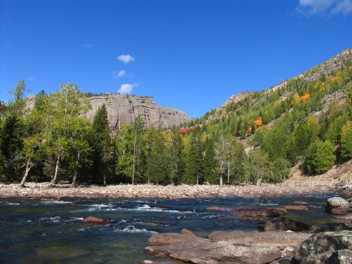 到了秋天,大東溝好比一個色彩繽紛的魔術師,金燦燦的白樺樹,紅艷艷的楊樹,深綠色的青松,重重疊疊,層林盡染,陪伴著湍流不息的額爾齊斯河水,不時傳來啄木鳥、布谷鳥、杜鵑鳥清脆的鳴叫聲。