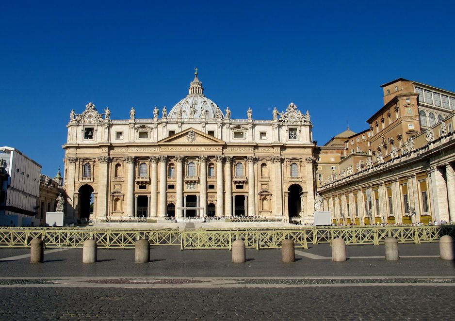 兩千年前的簡單墓地,四百年后修建了一座長方形會堂,后來毀于戰亂,一千年后尼古拉五世頒發重建命令,之后就是長達120年的重建,先后由意大利最優秀的建筑師住持設計施工,布拉曼特來了,米開朗琪羅來了,德拉?波爾塔來了,卡洛?馬泰爾也來了。1626年11月18日正式宣告落成,一臉肅穆的教皇烏爾班八世主持落成典禮。