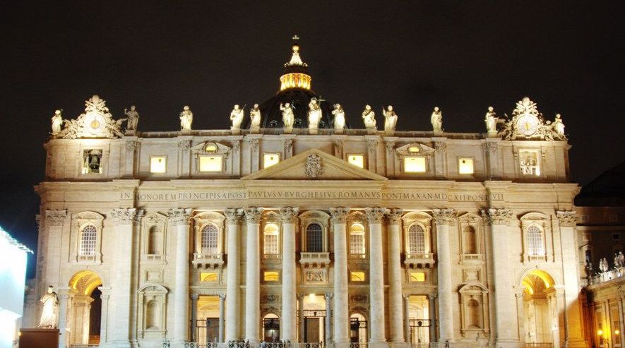 圣彼得教堂建于公元324年,是世界上最宏大最壯麗的天主教堂,造型非常傳統而神圣,整棟建筑呈現出一個十字架的結構,建于圣彼德墓穴的正上方。1452年,尼古拉五世下令重建,1506年由意大利最優秀的建筑師布拉曼特、米開朗琪羅、德拉?波爾塔和卡洛?馬泰爾相繼主持設計和施工,終于在1626年完成了現在的模樣。
