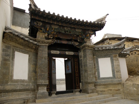 垂花門樓的大門,是瓦屋頂,三疊水式楹。門頭上方高懸著三重錯(cuò)落有致、優(yōu)雅精美的檐枋,上面分別雕鏤出富有寓意的圖案:第一重檐枋上透雕出幾尾游魚和兩條金龍,寓意為“魚躍龍門”;第二重檐枋上鏤出朝陽(yáng)和四只喜鵲,寓意為“四喜臨門”、“蒸蒸日上”;第三重檐枋上鐫刻著佛手、桃梨、香爐、寶瓶等物,象征著“福祿壽”。旁邊雕斗上鏤空的金馬、碧雞,寓意“金碧輝煌”。金馬、碧雞傳說(shuō)是古代滇池邊的兩種神物,如今已經(jīng)成為云南的象征之物。 在大門前,有一對(duì)刻著龍鳳圖案的石鼓,據(jù)說(shuō)兩個(gè)石匠花了一年的功夫才大功告成。兩個(gè)石匠把他們這件生命的杰作交給世人;朱氏家族用銀兩和心血留下了這幢華麗的建筑。