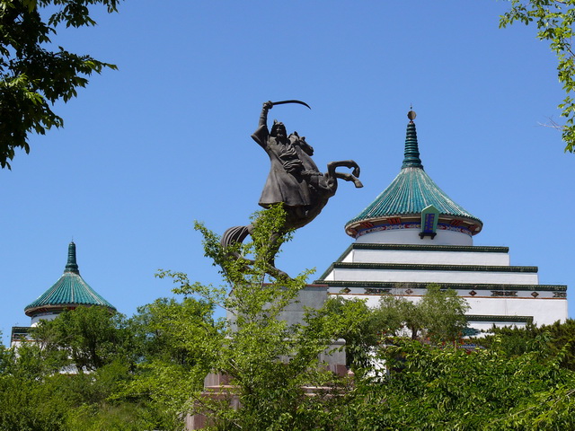 成吉思汗廟坐落在興安盟烏蘭浩特市罕山之巔,始建成于1940年,這座融漢、蒙、藏三個(gè)民族建筑風(fēng)格于一體的廟宇,從正面看是"山"字形。正殿當(dāng)中有16根粗大的紅漆明柱,四周繪有反映成吉思汗業(yè)績(jī)的精美圖案,中央為2.8米高的成吉思汗銅像;兩偏殿陳列有元代的兵器,服裝,瓷器等復(fù)制品,山門到正殿有寬10米、長(zhǎng)158米用花崗巖砌成的81級(jí)臺(tái)階。