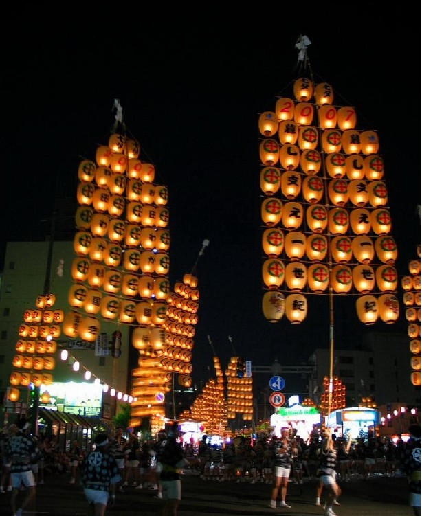 生鬼節(jié):被指定為國家重要無形民俗文化財(cái),流傳于日本東北地方男鹿半島。兩個戴著鬼面具露著兩支大獠牙的人(一個是紅臉,一個是青臉),身上穿著稻草衣,握著菜刀,提著桶,挨家挨戶地拜訪居民,大聲叫著嚇唬那些不勤勞的男人、愛哭的小孩以及不愿意做家務(wù)的媳婦。該儀式,除了秋田縣能代市,山形縣游佐町、巖手縣大船渡市三陸町吉浜等多個東北一帶沿海地方都有存在。[20]秋田竿燈祭:日本東北地區(qū)代表性的夏季節(jié)慶,與青森縣的耐布它祭、仙臺的七夕祭并稱為東北三大祭。竿燈把幾十個馬燈整齊地掛在一個粗竹竿上,竹竿的頂端系著“御幣(剪成細(xì)條的紙)”,版權(quán)所有聊城聊之旅國際旅行社有限公司,轉(zhuǎn)載必究!撐竿的人將竿燈或托于手掌,或頂于額頭,或支于肩,或載于腰腹,猶如玩耍中國雜技。西馬音內(nèi)盂蘭盆舞會(羽后町):為“日本三大盂蘭盆舞會”之一,參加者身著傳統(tǒng)服裝,戴著斗笠,并用黑布蒙住臉,伴隨著用笛子、鼓、三弦的演奏,一直舞蹈至深夜。西馬音內(nèi)盆踴,已被列為重要無形民俗文化財(cái)產(chǎn)。舉行時(shí)間是8月16日至18日。