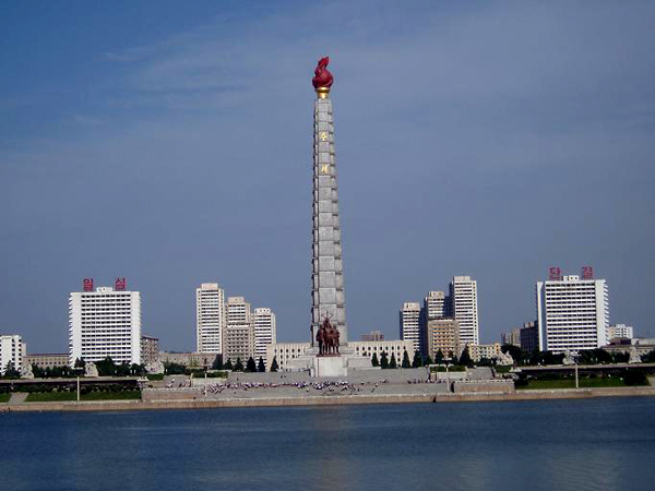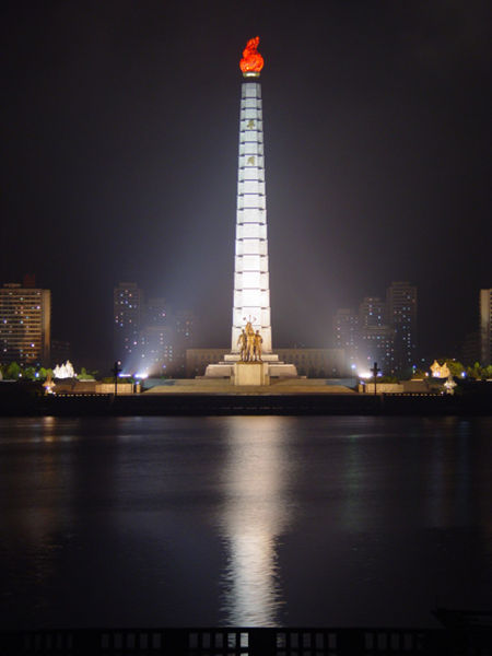 主體思想塔(????? Juche Tower) 位于朝鮮民主主義人民共和國首都平壤市市中心的大同江畔,是為祝賀金日成七十壽辰而建的,塔及其周圍附屬建筑占地總面積15萬平方米。1982年4月15日竣工揭幕。主體思想塔是金日成主席創立的“主體思想”的象征。塔的正面,建有高30米、重33噸的象征工人、農民、知識分子的三人群像,左右是以“主體工業”、“豐年”、“學習之國”、“無病長壽”、“主體藝術”、“銅墻鐵壁”為主題的花崗巖群像。