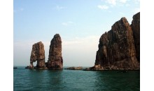 高山島,屹立于廟島群島中部西側,隸屬砣磯鎮。這個面積僅有0.46公里的無居民小島,在諸島排列中列第12位。它集海蝕崖、海蝕洞、海蝕柱、海蝕礁、海蝕階地和海積卵石灘于一身;納高雄、險峻、幽深、粗獷靈秀于一隅。它裸露著胸懷,放蕩無拘地把海島的地質遺跡向世人全方位的展示,可謂長島地區地質遺跡的“天然地質公園”。