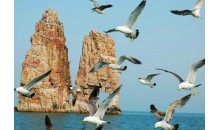 萬鳥島又稱車由島,坐落于長島諸島中部偏東,這個海拔73.5米、僅有0.05平方公里的小島,在浩渺的汪洋大海之中,簡直是一粒微不足道的沙粒,然而海深魅力大,島小情趣多,島上棲居著上萬只海鷗,被稱為“萬鳥島”。萬鳥島,又稱車由島,遠遠望去,酷似一艘錨泊的登陸艦。全島海岸線長1.25公里,海岸地貌懸崖陡壁占90%以上,這些如劈如削的斷崖,多石英巖與極巖,破碎性強,經風化和海蝕,崖壁此凸彼凹,石階、石臺、石窟、石穴鱗次櫛比,形成一座自然的海鷗“石樓”。