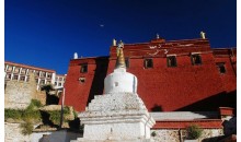 嘎東寺位于日喀則白朗縣年楚河以北16公里嘎東鎮境內。嘎東寺歷經寧瑪派、噶舉派、薩迦派,到十七世紀中葉開始盛行格魯派。寺中珍藏有舉世罕見的寶物,即該寺第四任堪布桑布欽布的兩條徑骨和空行母絲薩曲珍的頭顱。在桑布欽布右徑骨上端的骨縫四周天然生成著微小的釋迦牟尼、觀音菩薩、無量光佛、護法神、度母五尊佛像;左脛上端天然生成著微小的釋迦牟尼佛像和4個白色舍利;在度母化身空行母絲薩曲珍的頭顱上天然生成著三個藏文字母和度母像。原嘎東寺已被毀壞,1985年在原址上重新修建了嘎東寺。