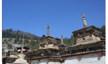 卡瑪多塔林位于類烏齊縣國道317線右側(cè),距縣城25公里。塔林依山位傍水、風(fēng)景秀麗、古木參天、蒼松翠柏、四季常青。在蔥郁翠柏中有一座別致的小經(jīng)堂,主供蓮花生大師像,左右各豎有幾根高大的轉(zhuǎn)經(jīng)筒。傳說,過去這兒有108個(gè)塔,現(xiàn)已恢復(fù)和修建的塔有幾十座。其造型各異,別具一格,既有要求嚴(yán)格的八佛塔,也有方形怪塔;既有幾米高的大塔,也有不到三米的小塔。