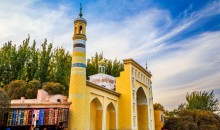 汗騰格里寺位于市南門。因寺院地處南門,故得名南門大寺。1902年進行過重建,1987年前,在原來南關清真寺的基礎上又加以擴建,改用今名“汗騰格里”(王中之王的意思),是市內較大的維吾爾族清真寺之一。重建后的大寺,位于南門臨街,坐西向東,外觀壯麗,造型美觀,四座高大尖塔,簇擁著中間的大圓屋頂,兩側另有兩個小圓頂陪襯,具有濃郁而典雅的伊斯蘭建筑風格。