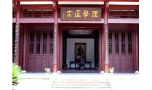 造型莊重、嚴謹的武夷山朱熹紀念館,是一座于1990年落成的廡殿式大院。館內懸掛著新近書寫的匾額、楹聯,其中有不少聯文,語言精練、寓意深長,文彩斐然。古樸的大門上高懸著一塊大匾,題為“朱熹紀念館”五個醒目大字。是方毅同志在武夷山視察時留下的墨寶,莊重、蒼勁,有書法大家的風范。朱熹在武夷山講學40余年,繼承和發展了理學體系。殿前大門兩側的草書楹聯表達了朱熹繼承和發展的深邃意義。