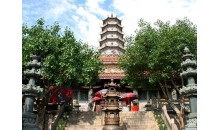 據清光緒《嘉應州志》載,由南漢王劉鋹始建于大寶八年(公元965年),距今已有一千多年歷史。鐵塔分為七層,身高4.2米,呈四方形,塔底邊長1.6米,為生鐵鑄成,每面鑄有大小佛像250個,四面合計為一千佛,故名千佛塔。原塔建于修慧寺,因寺毀,清乾隆初年嘉應州官王者輔將鐵塔移于梅城東巖山頂,上面蓋亭宇,周圍筑欄桿,并砌石階,以供游覽者登臨觀賞。