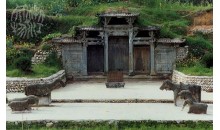 因雕有一百個不同書體的壽字而得名。坊以青色魚子狀石灰巖構成,通高l3米、寬8米,四柱三間三層樓閣式建筑。其獨特之處是:坊座雕有8頭矯健雄獅昂首遠望,8條出水蚊龍繞柱回舞,額枋上飾滿盛開牡丹,與正間上下額枋祥云間翩翩飛舞的5只透雕仙鶴、次間上額枋浮雕的相對翱翔之鸞鳳構成了具有無窮魅力之藝術佳作,寓意福壽萬年、富貴無媲或喜上眉梢。
